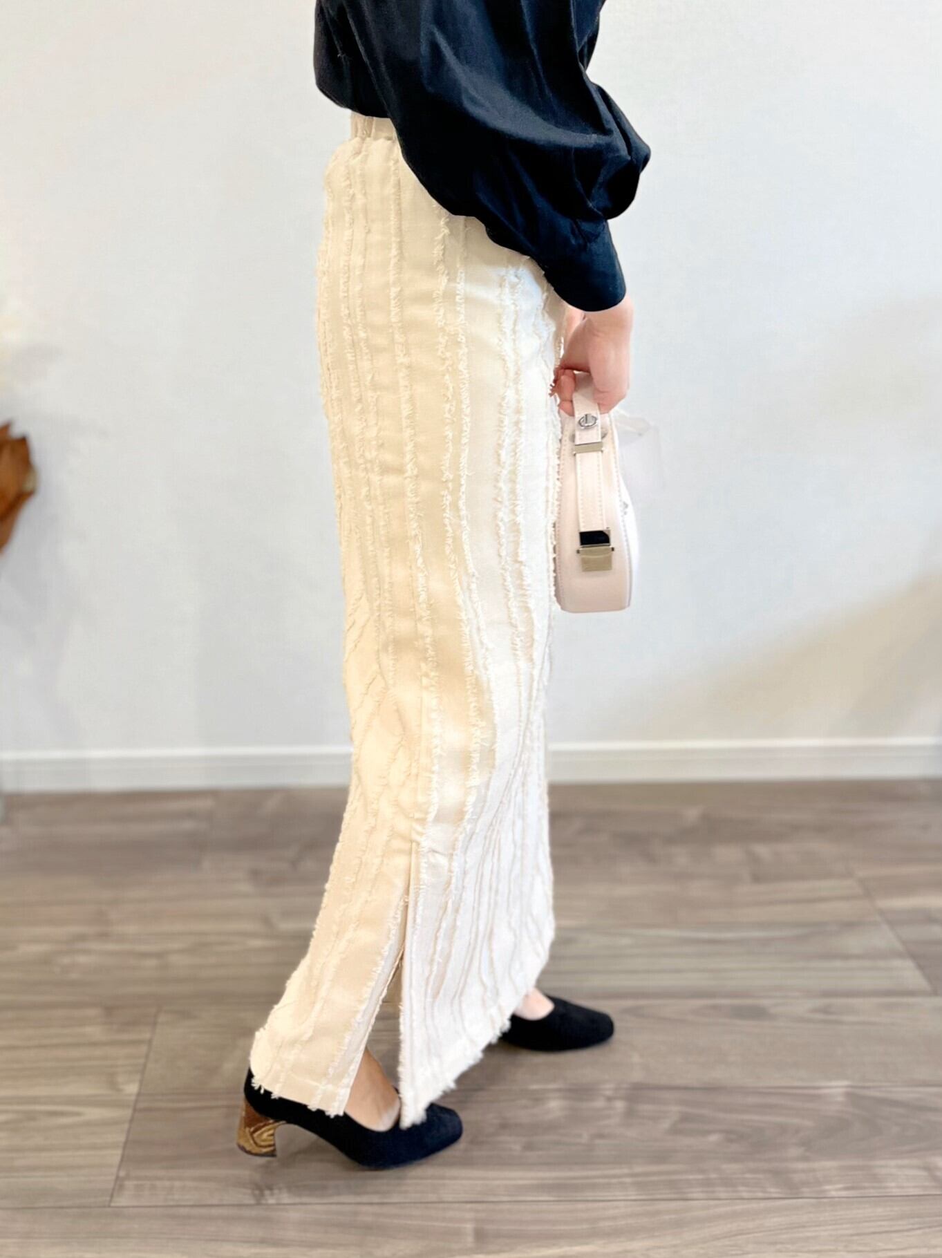 縦ストライプで表面感のあるテキスタイルも脚長効果を発揮し、メリハリのある着こなしになります。