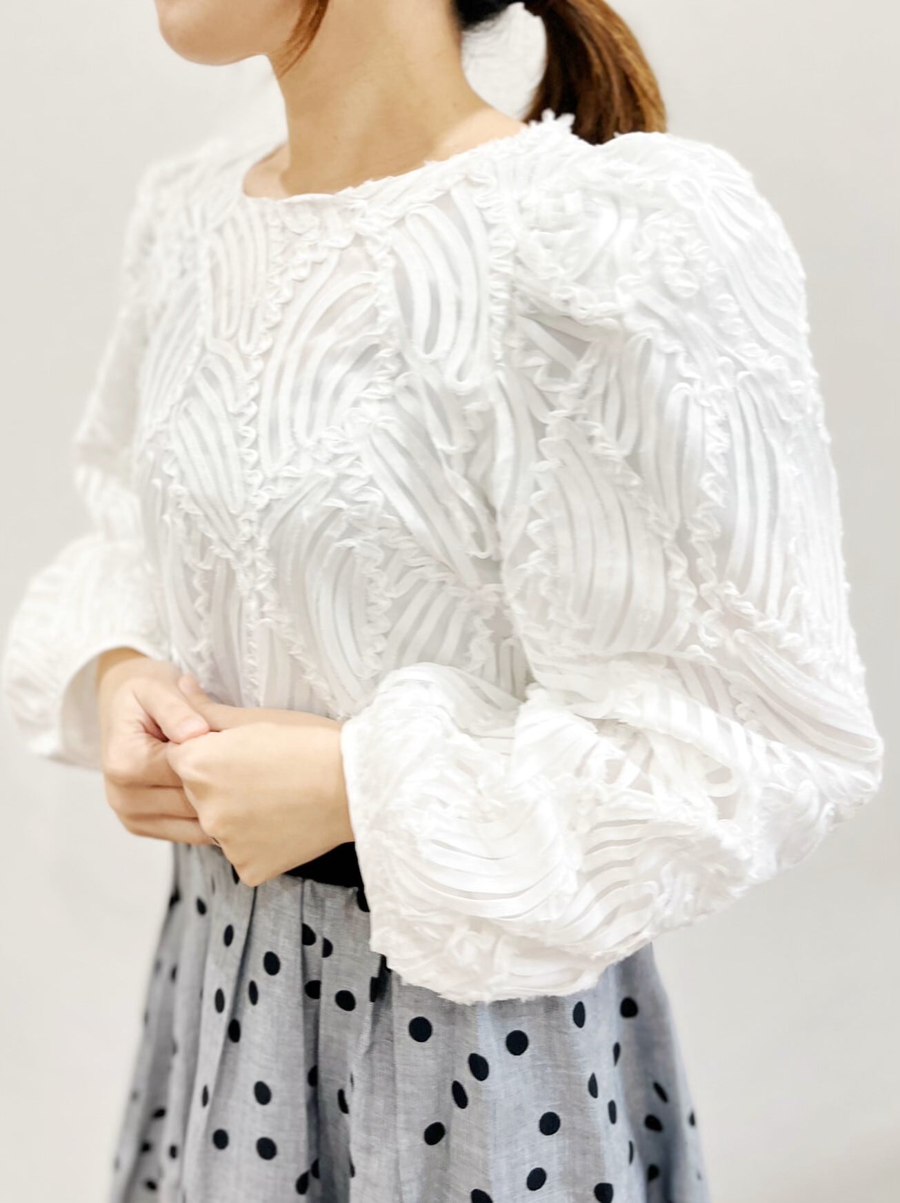 オケージョンブラウスとしてももちろんですが、デイリーユースとしてカジュアルミックスの着こなしも楽しめます。